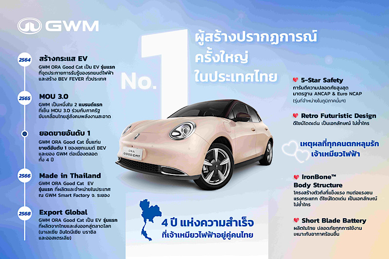 GWM (Thailand) ยกระดับสู่การเป็นแบรนด์รถยนต์ที่มีผลิตภัณฑ์ครอบคลุมทุกประเภทพลังงานที่ตอบสนองความต้องการของผู้ใช้งานทั่วทุกมุมโลก ด้วยแนวคิด “ครอบคลุมทุกการใช้งาน (All Scenarios) ด้วยผลิตภัณฑ์ที่ครอบคลุมทุกพลังงาน (All Powertrains) สู่การตอบสนองทุกกลุ่มผู้ใช้งานอย่างแท้จริง (All Users)” ฉลองครบรอบ 4 ปีเต็มในประเทศไทยของ GWM ORA Good Cat “เจ้าเหมียวไฟฟ้า” ยอดนิยมที่ครองใจแฟน ๆ ชาวไทย ที่ไม่เพียงสร้างกระแสความนิยมในรถยนต์ไฟฟ้า (BEV) ในประเทศ แต่ยังได้กลายเป็น “ไอคอน” ตัวจริงที่ได้สร้างปรากฏการณ์ใหม่ๆ ให้แก่อุตสาหกรรมยานยนต์ไทย กับ 5 ความสำเร็จของ GWM ORA Good Cat ที่เกินคาดในด้านต่างๆ ครอบคลุมทั้งความสำเร็จในการเป็น “อันดับหนึ่ง” และ “ครั้งแรก” ในหลากหลายด้านตลอดระยะเวลา 4 ปีที่ผู้ใช้งานชาวไทยให้ความเชื่อมั่น กับดีไซน์ที่โดดเด่นไม่ซ้ำใคร คุณภาพระดับโลก พร้อมระบบอัจฉริยะในการขับขี่และระบบความปลอดภัยที่ล้ำหน้า สร้างความโดดเด่นเสริมคาแรกเตอร์ที่ชัดเจนให้กับคนรุ่นใหม่