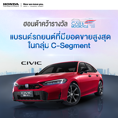 บริษัท ฮอนด้า ออโตโมบิล (ประเทศไทย) จำกัด ประกาศความสำเร็จ คว้ารางวัล “แบรนด์รถยนต์ที่มียอดขายสูงที่สุดในกลุ่ม C-Segment” ในงาน THAILAND CAR OF THE YEAR 2025 จัดโดยสมาคมผู้สื่อข่าวรถยนต์และรถจักรยานยนต์ไทย (สรยท.) สะท้อนถึงความเชื่อมั่นและการตอบรับอันดีเยี่ยมจากลูกค้าชาวไทยในรถยนต์กลุ่ม C-Segment นำโดย ฮอนด้า ซีวิค และทางสมาคมฯ นับรวมรถยนต์กลุ่ม L-SUV Segment นำโดย ฮอนด้า ซีอาร์-วี ซึ่งมียอดขายรวมทั้ง 2 รุ่น กว่า 19,000 คัน ในปีที่ผ่านมา ความสำเร็จครั้งนี้แสดงถึงวิสัยทัศน์ของฮอนด้าในการสร้างสรรค์ยนตรกรรมและยกระดับมาตรฐานยานยนต์ เพื่อส่งมอบความมั่นใจและความพึงพอใจสูงสุดให้แก่ลูกค้า