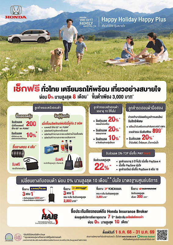 บริษัท ฮอนด้า ออโตโมบิล (ประเทศไทย) จำกัด เสิร์ฟความอุ่นใจส่งท้ายปีกับแคมเปญสุดพิเศษ “Happy Holiday Happy Plus! เที่ยวทั่วไทย คุ้มสบายใจ” พร้อมดูแลรถยนต์คู่ใจแบบครบวงจร สำหรับครอบครัวฮอนด้าบริการตรวจสภาพรถยนต์ฟรี* พร้อมผ่อนสบายไร้กังวล ! สำหรับงานบริการทุกประเภท ผ่อนชำระ 0% นานสูงสุด 8 เดือน* อัปเกรดความคุ้มค่า รับส่วนลดผลิตภัณฑ์ที่กำหนดมูลค่าสูงสุด 20%* สำหรับครอบครัวฮอนด้าทั้งลูกค้ารถใหม่ รถเก่า และรถมือสอง พร้อมโปรแกรมผ่อนชำระยางรถยนต์ 0% นานสูงสุด 10 เดือน* สิทธิพิเศษสุดคุ้มที่ครบ จบ ทุกความต้องการ ! เพียงนัดหมายและนำรถยนต์เข้ารับบริการที่ศูนย์บริการรถยนต์ฮอนด้าทั่วประเทศ ตั้งแต่วันที่ 1 ธันวาคม 2568 ถึง 31 มกราคม 2569