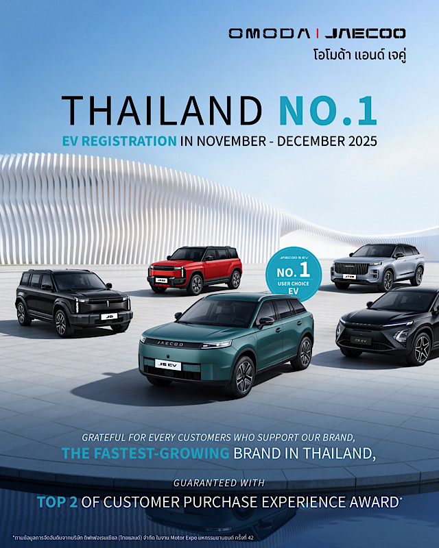 ขณะเดียวกัน ในช่วงเดือนพฤศจิกายน–ธันวาคม 2568 OMODA & JAECOO ยังสามารถก้าวขึ้นสู่ตำแหน่ง       แบรนด์รถยนต์ไฟฟ้าอันดับ 1จากยอดจดทะเบียนรถไฟฟ้าใหม่ในประเทศไทย ได้สำเร็จ นับเป็นอีกหนึ่งความสำเร็จสำคัญที่ตอกย้ำศักยภาพของแบรนด์ในการแข่งขันในตลาดรถไฟฟ้าที่มีอัตราการเติบโตสูง และสะท้อนถึงความแข็งแกร่งของเครือข่ายผู้จำหน่าย ระบบบริการหลังการขาย รวมถึงความสามารถในการส่งมอบผลิตภัณฑ์ที่ตรงกับความต้องการของตลาดอย่างต่อเนื่อง