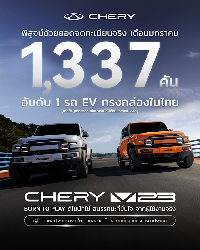 เชอรี ประเทศไทย สร้างปรากฏการณ์ความสำเร็จตั้งแต่ต้นปี 2569 ด้วยกระแสตอบรับที่ร้อนแรงจากผู้บริโภคชาวไทย หลังรถยนต์ เชอรี รุ่น V23 มียอดจดทะเบียนในประเทศไทยมากกว่า 1,337 คัน ภายในเดือนมกราคม 2569 ตอกย้ำถึงความนิยมและความเชื่อมั่นที่ผู้บริโภคมีต่อรถยนต์เชอรีในตลาดประเทศไทยอย่างชัดเจน