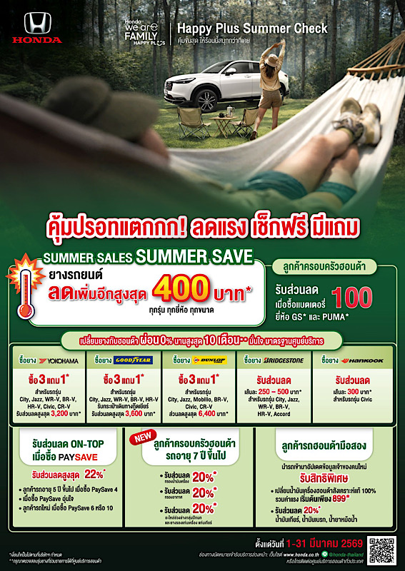 บริษัท ฮอนด้า ออโตโมบิล (ประเทศไทย) จำกัด พร้อมต้อนรับหน้าร้อน ชวนครอบครัวฮอนด้าเดินทางพร้อมความอุ่นใจด้วยแคมเปญตรวจเช็กรถยนต์ Happy Plus Summer Check คุ้มขั้นสุด ให้ร้อนนี้สนุกกว่าที่เคย เพราะทุกการเดินทางต้องมาพร้อมความปลอดภัย สำหรับลูกค้าครอบครัวฮอนด้าตรวจสภาพรถยนต์ฟรี ! และพิเศษสุดกับส่วนลดยางรถยนต์เพิ่มเติม !!สูงสุด 400 บาท* พร้อมทางเลือกผ่อนง่ายสบายกระเป๋า ดอกเบี้ย 0% สูงสุด 10 เดือน ขั้นต่ำ 2,000 บาท** เพียงนัดหมายและนำรถยนต์เข้ารับบริการที่ศูนย์บริการรถยนต์ฮอนด้าทั่วประเทศ ตั้งแต่วันที่ 1 – 31 มีนาคม 2569