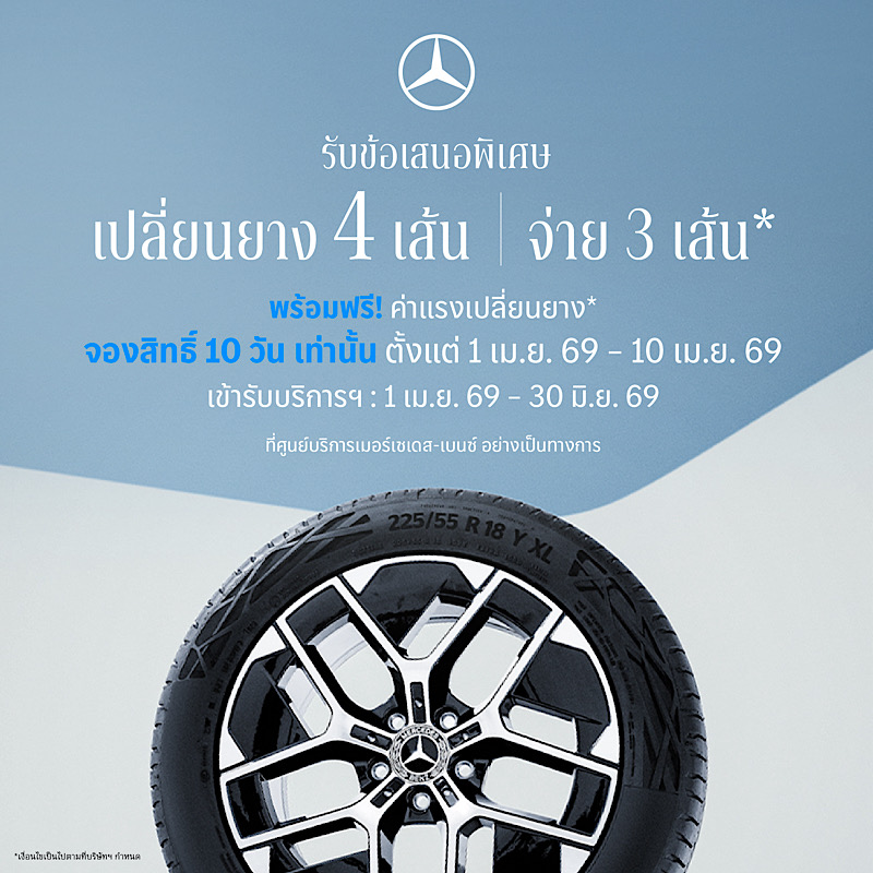 - สิทธิพิเศษสำหรับลูกค้าที่จองสิทธิ์เปลี่ยนยางรถยนต์เมอร์เซเดส-เบนซ์ จำนวน 4 เส้น เฉพาะยี่ห้อ Michelin, Pirelli, Continental, Goodyear, Bridgestone, Yokohama ที่ศูนย์บริการฯ ที่เข้าร่วมโปรแกรม MB Tires ตั้งแต่ 1 เม.ย. 69 –10 เม.ย. 69 และชำระค่าใช้จ่ายภายในระยะเวลาตั้งแต่ 1เม.ย. 69 – 30 มิ.ย. 69