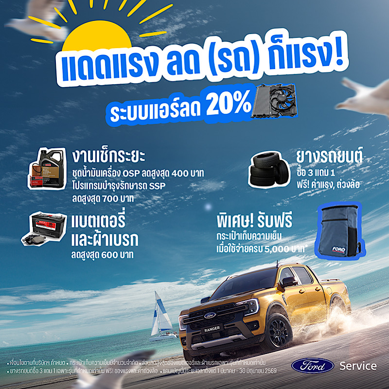 ฟอร์ด ประเทศไทย มอบความมั่นใจและความปลอดภัยในช่วงเทศกาลวันหยุดฤดูร้อนที่ลูกค้ารถฟอร์ดต้องเดินทางไกล จัดแคมเปญบริการหลังการขายสุดพิเศษ ‘แดดแรง ลด(รถ) ก็แรง’ ชวนลูกค้านำรถเข้าตรวจสภาพให้พร้อมสู้ลมร้อน ด้วยข้อเสนอสุดคุ้ม อาทิ ส่วนลดอะไหล่ระบบแอร์ 20% ส่วนลดแพ็กเกจเช็กระยะสูงสุด 700 บาท โปรโมชันยาง 3 แถม 1 และรับฟรี กระเป๋าเก็บความเย็น ตั้งแต่วันที่ 1 มีนาคม – 30 มิถุนายน2569 ที่ศูนย์บริการฟอร์ดทั่วประเทศ