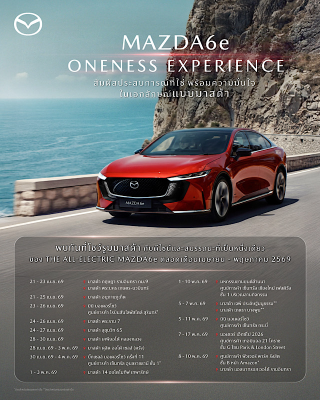 มาสด้าตอบรับเสียงเรียกร้องจากลูกค้า ภายหลังสร้างปรากฏการณ์กระแสตอบรับอย่างท่วมท้นกับรถไฟฟ้ารุ่นใหม่ THE ALL-ELECTRIC MAZDA6e ในงานมอเตอร์ โชว์ ที่ผ่านมา ด้วยการจัดกิจกรรม “MAZDA6e ONENESS EXPERIENCE สัมผัสประสบการณ์ที่ใช่ พร้อมสร้างความมั่นใจในเอกลักษณ์แบบมาสด้า” ที่โชว์รูมมาสด้าและห้างสรรพสินค้าชั้นนำตลอดเดือนเมษายนและเดือนพฤษภาคม 2569 เพื่อให้ลูกค้าในพื้นที่ต่างๆ ได้สัมผัสรถคันจริงอย่างใกล้ชิด และได้ทดลองสมรรถนะการขับขี่อันเป็นเอกลักษณ์ของรถยนต์มาสด้า ที่ได้รับการยอมรับมาอย่างยาวนานจากลูกค้าทั่วโลก โดยผู้ที่สนใจสามารถสอบถามข้อมูลได้ที่โชว์รูมมาสด้าใกล้บ้านทั่วประเทศได้แล้วตั้งแต่วันนี้ หรือศึกษาข้อมูลเพิ่มเติมที่ www.mazda.co.th